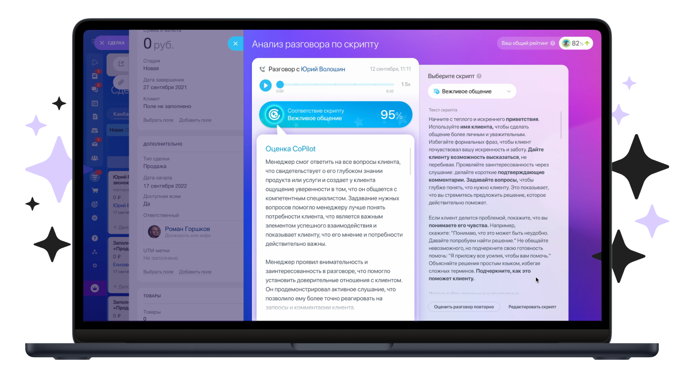 AI покажет, насколько звонок соответствует скрипту. Даст рекомендации по улучшению и составит рейтинг менеджеров — всё сам, без вашего участия